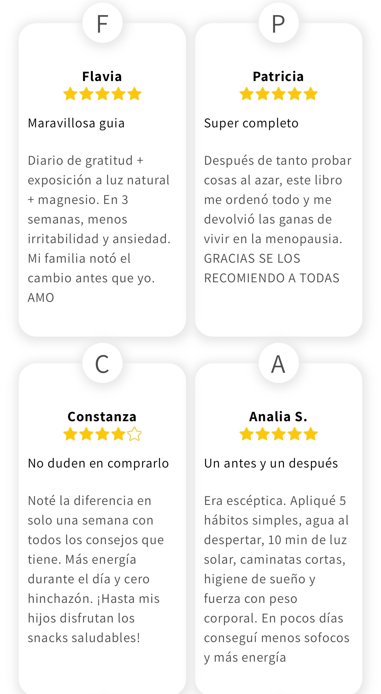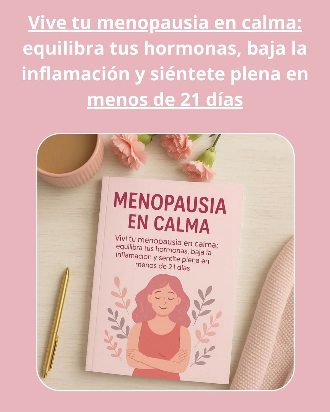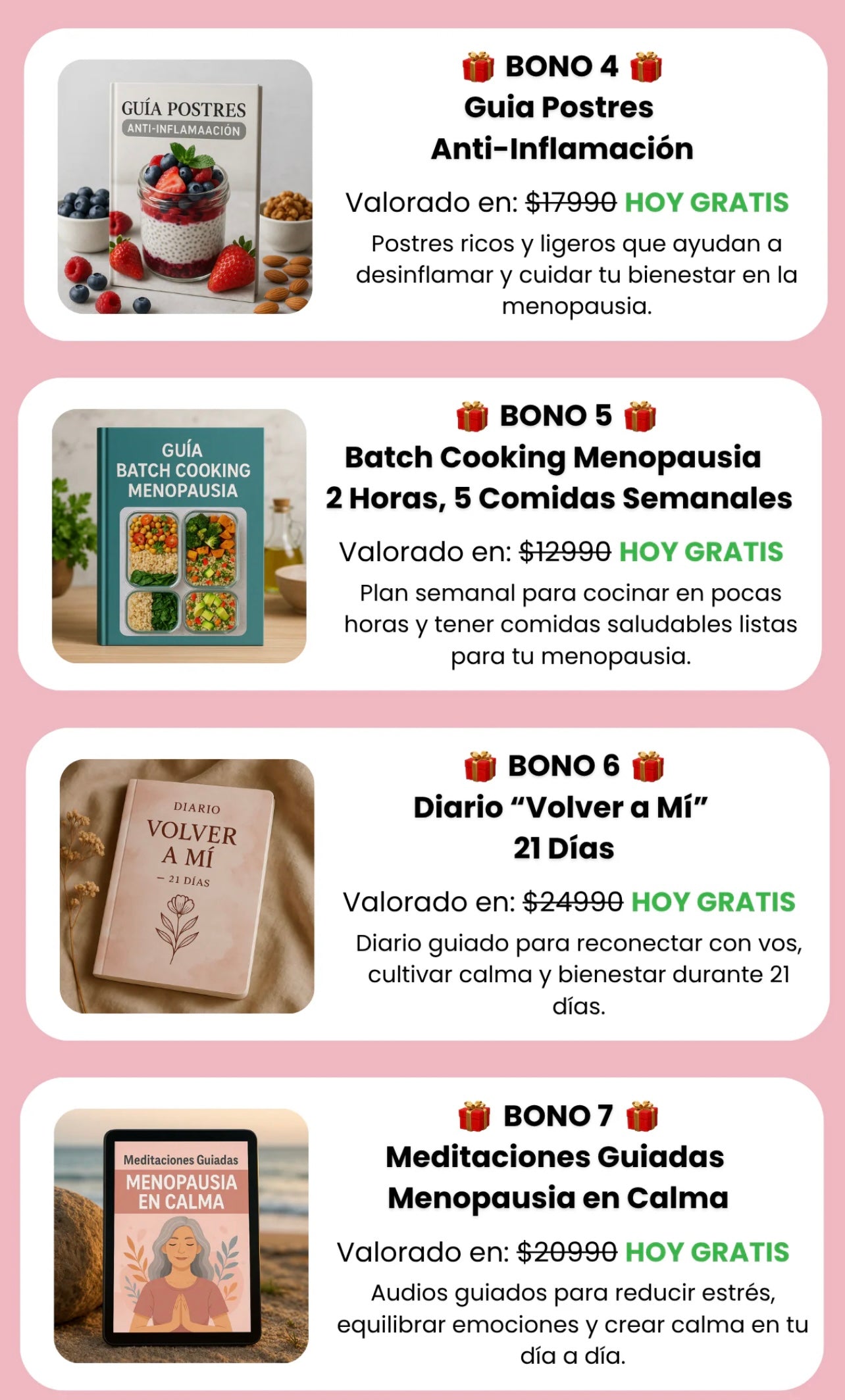 Vas a recibir el ebook Menopausia en Calma en formato digital PDF, más todos los bonos exclusivos incluidos en esta oferta especial (recetarios, plan de 21 días, plantillas, guías y recursos de apoyo).